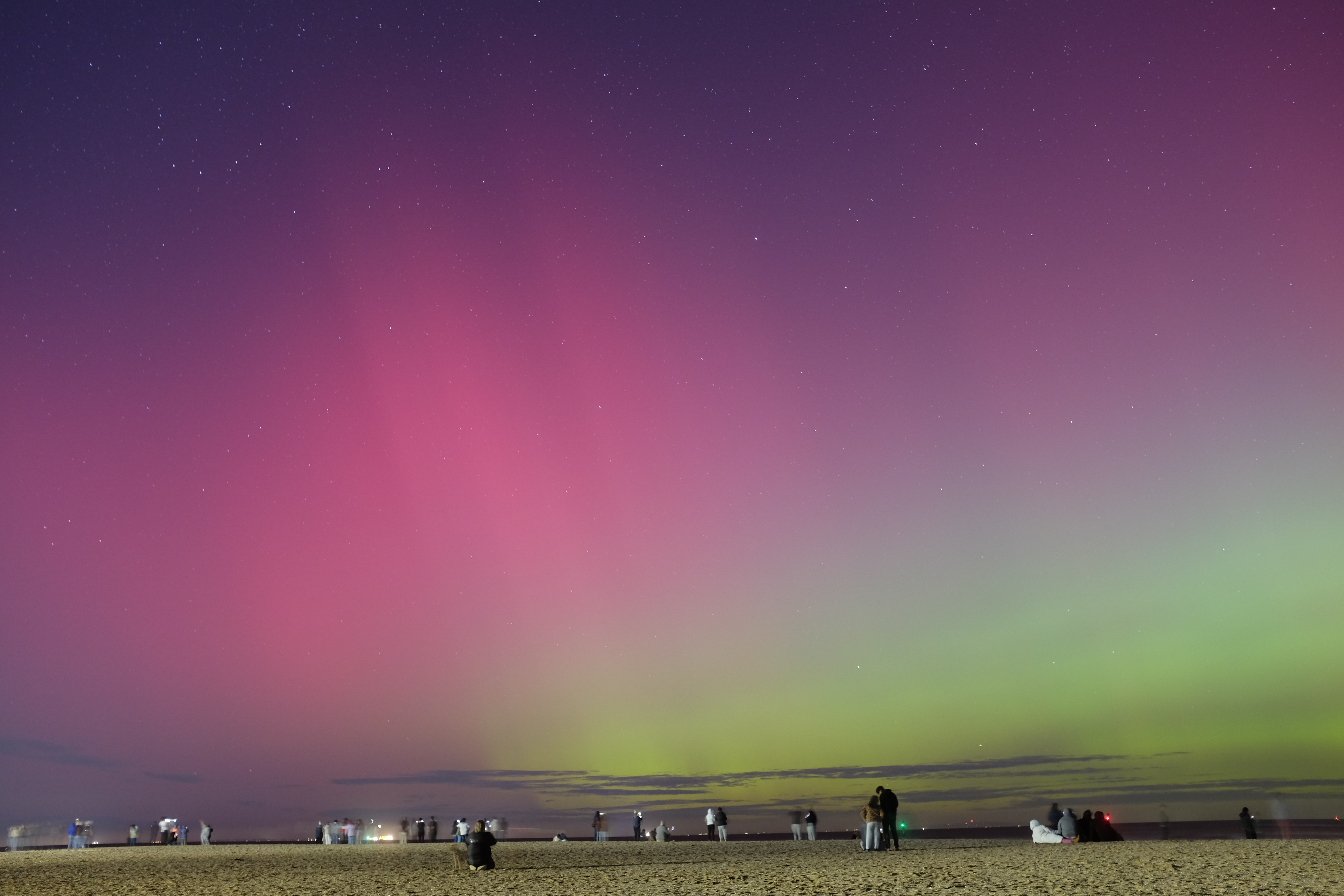 第一次遇到墨尔本的极光预报KP值来到9,虽然知道这次会比较强但是没想到能直接在市区顶着光污染也能看见。太阳落山大约一小时之后天空基本黑到位,在大洋路的海边,正南方会明显感觉到有光源,但是强度不是特别强,类似于城市光污染的漫反射。颜色肉眼看过去是白色,但是相机拍出来就会带上黄色到绿色。红色的极光是肉眼可见的,在天上淡淡的一层红雾,不会很清晰,但是你能感知到这块是红色的,当然拍出来就鲜艳多了,从橙色到紫红色不一而足。强度较高的时候还能肉眼看出光柱,拍出来当然也更加明显。极光的颜色,形态和强度会不断变化,所以相机可以一刻不停的拍,每一张都会有些许不同。不过总体光照很弱,所以都是长曝光,30秒一张。有人也拍出来了实时的视频,需要ISO达到50万的级别。最后极光的色彩跟它发生的位置有关,而墨尔本相对而言纬度不够高,所以较多看到红色系的极光,因为红色极光的发生高度是最高的。